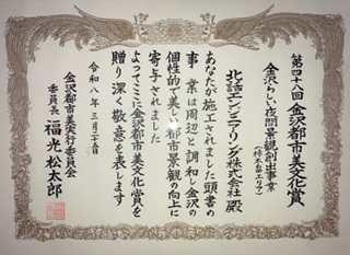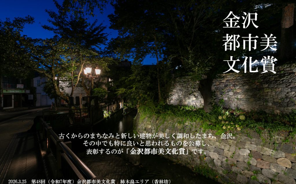 本賞は昭和53年に創設され、金沢の優れた建造物、ストリートファニチャーや広場、そのライトアップなど美しい都市景観に寄与する作品の施主・設計者・施工者を表彰するものです。